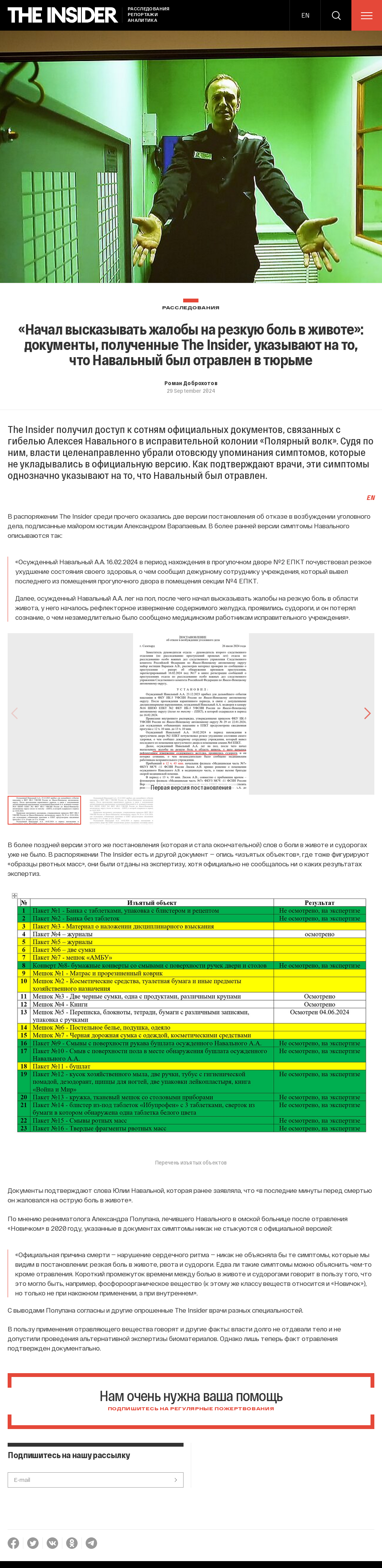 Результат не заставил себя долго ждать. Уже через 10 дней (29 сентября 2024 года) издание The Insider в спешном порядке подготавливает и вбрасывает в публичное информационное пространство статью под заголовком: «Начал высказывать жалобы на резкую боль в животе».